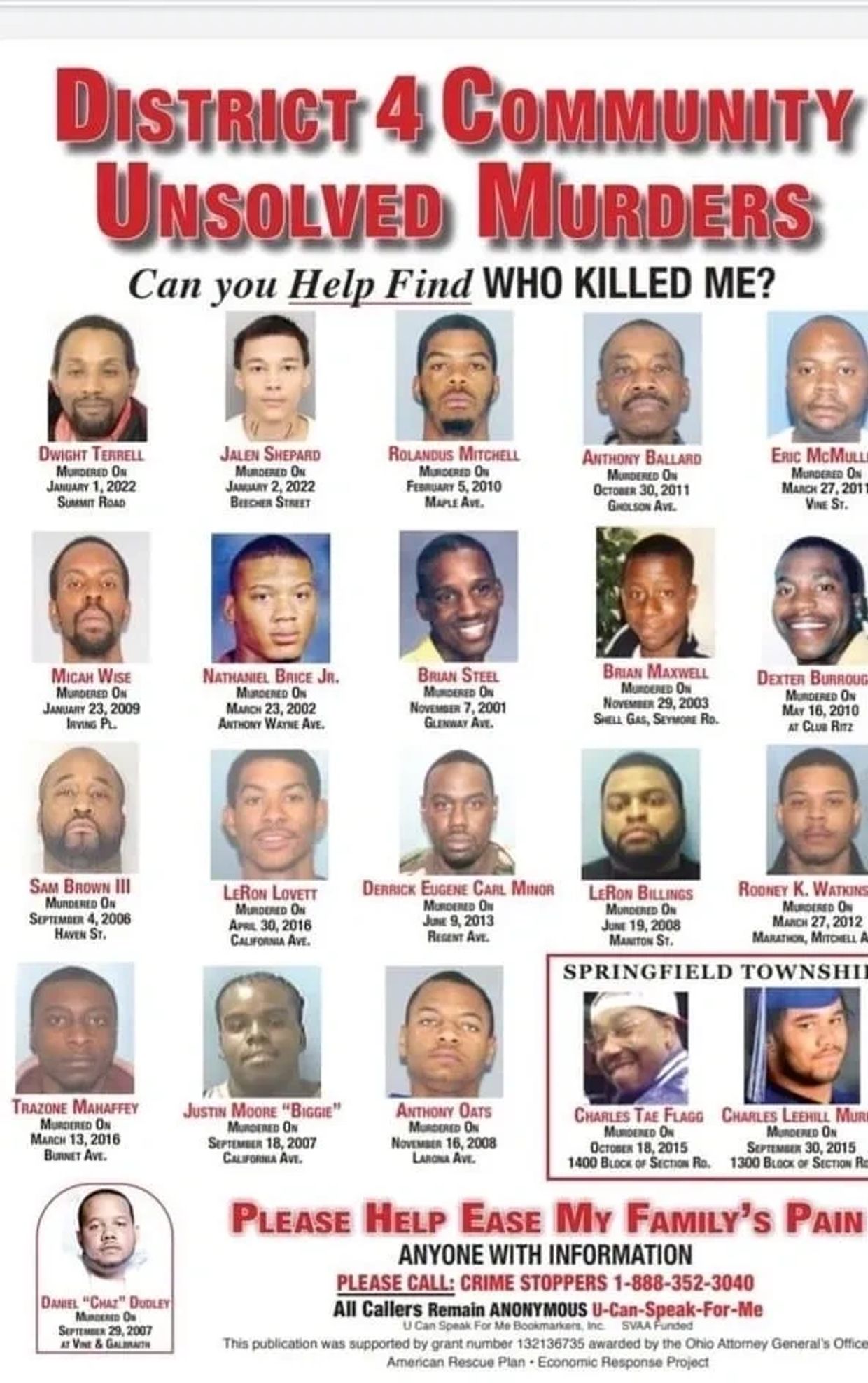 announced today, in partnership with CrimeStoppers and UCanSpeakForMe, the placement of posters within Ohio’s prisons in hopes of receiving more information that could lead to answers for some of the estimated 5,000 cold case homicides in Ohio.