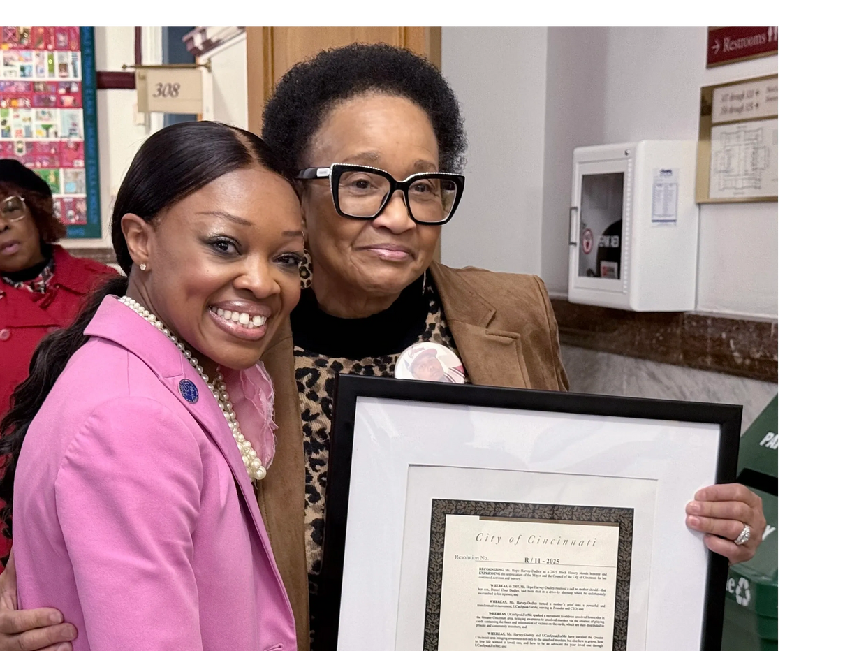 On Wednesday, March 5, 2025 the City of Cincinnati elected officials said “yes, we hear you”. Part of the proclamation says “Whereas, Ms. Harvey Dudley and UCanSpeakForMe have traveled the Greater Cincinnati area, bringing awareness to the unsolved murders, but also how to grieve, how to live life without a loved one, and how to be an advocate for your loved on through UCanSpeakForMe”.